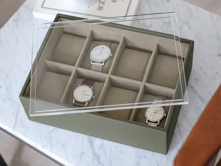 Klokkeboks Herre Stackers Grønn 8. Stackers Olive Green. Stilig klokkeoppbevaringsboks. Vegansk skinn. Akryllokk som kan bli gravert. En perfekt gave til mannen som elsker klokkene sine!